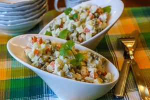 Салат с крабовыми палочками, солеными огурцами и овощами Ингредиенты: огурец соленый (или маринованный) - 200г йогурт (без добавок, густой) - 80-100 мл палочки крабовые - 180г картофель - 150-170г