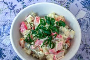 Салат с крабовыми палочками, солеными огурцами и овощами