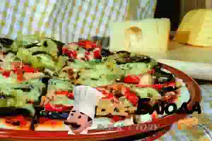 3. Лепешки смазать томатным соусом и выложить на них баклажаны. Раскладывая баклажаны, старайтесь накладывать кружки один на другой, как черепицу. Перцы промыть, срезать плодоножку, удалить семена. Нарезать перцы кольцами и разложить поверх баклажанов.