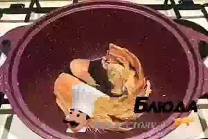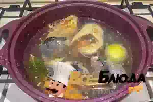 2. Как только пена на бульоне перестанет образовываться, положить в бульон очищенную луковицу, морковь, горошины черного перца и лавровый лист. Варить на слабом огне 40 минут после закипания.