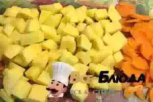 5. Нарезать крупными кубиками очищенный картофель. Отварную морковь нарезать кружочками или соломкой. Или натереть на крупной терке.