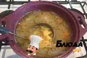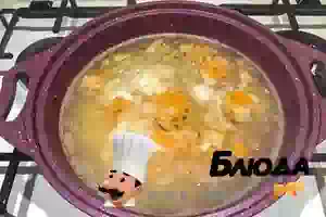 6. Переложить в чистую кастрюлю морковь и картофель, засыпать промытое пшено, залить горячим рыбным бульоном. Посолить по вкусу и поставить уху на слабый огонь вариться до готовности овощей и крупы.