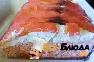 Паштет-рулет из лосося и голубого сыра Ингредиенты: лосось холодного копчения - 500г укроп, эстрагон, перец горошком соль, лимонный сок - по вкусу сыр с голубой плесенью - 250г желатин порошковый - 3 ст.л. томатный соус - 2 ст.л. репчатый лук - 1 шт. лосось сырой - 1кг сливки - 300 мл майонез - 100г сметана - 300г