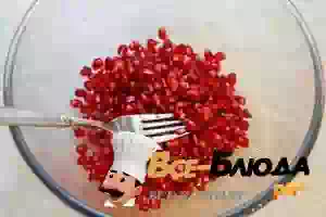 2. Очищенный зерна пересыпать в посуду, в которой будете готовить крющон. Зерна помять до выделения сока. Можно вилкой, пестиком или толкушкой. Сока получится достаточно.