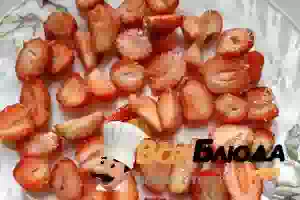 1. Ягоды клубники перебираем, удаляем листочки и прочий садовый мусор. Отрываем плодоножки и промываем клубнику под проточной водой. Перекладываем на бумажное полотенце, чтобы убрать излишек воды, после чего и разрезаем на половинки или четвертинки.
