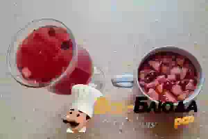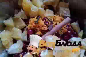 5. С яблок срезать кожуру, нарезать мелкими кубиками и добавить к остальным фруктам-ягодам в кастрюле. Залить все вином.