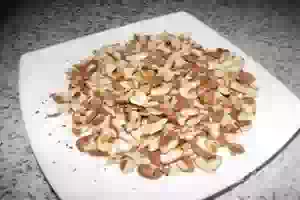 1. Ядра миндаля залейте крутым кипятком. Дайте ему постоять, затем остудите орехи и снимите с них кожицу. Обжарьте миндаль на сухой сковороде, добавьте абрикосовые косточки. Содержимое сковороды порубите ножом.