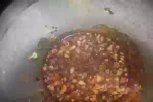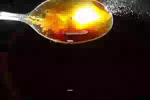 2. Пересыпьте миндаль и абрикосовые косточки в двухлитровую банку. Добавьте к ним ваниль, корицу, кофе, гвоздику, перец. Сделайте сироп. Для этого насыпьте сахар на сковороду, добавьте сто миллилитров воды, доведите все до состояния карамели. Затем влейте остаток воды и перемешайте.