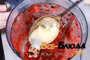 1. Клубнику, не размораживая, измельчить в блендере в мелкую крошку. Добавить к клубнике мёд, предварительно перемешав ложкой пюре, чтобы ягоды не остались прилипшие к ножу блендера. Влить 1-2 ст.л воды, перемешать пюре с медом.