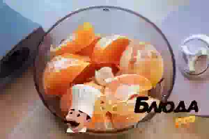 2. Сложите мандариновые дольки в чашу блендера и измельчите. Если нет блендера, раздавите дольки обыкновенной картофелемялкой.