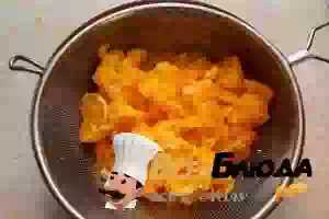 3. Размятые мандарины переложите в металлическое сито. Прижимая столовой ложки, выдавите сок. Сок соберите в отдельную миску.