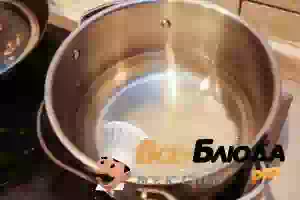 4. Затем сварите легкий сахарный сироп. Для этого налейте воду в кастрюлю, добавьте сахар и вскипятите. Проварите, помешивая, примерно 3 минуты, снимите кастрюлю с огня и дайте сиропу остыть.