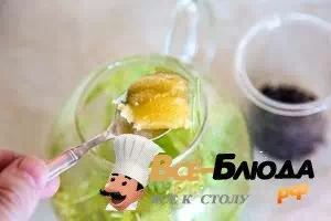 3. Налить в чайник немного кипятка, добавить 3 ч.л. меда (или по вкусу). Перемешать, чтобы мед растворился. Не волнуйтесь, чай слегка помутнеет.