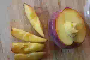 2. Персик вымыть, разрезать пополам, удалить косточку, а мякоть нарезать дольками.