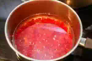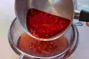 5. В эту же посуду слить настой костяники. Саму костянику хорошо протереть через металлическое сито, чтобы отделить мякоть от косточек. Мякоть переложить в настой, косточки выбросить.