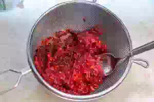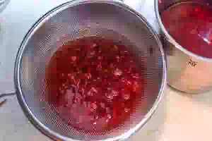 3. Получившуюся ягодную массу переложить на металлическое сито и хорошо протереть, собрав в миску сок и пюре.