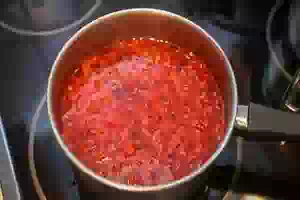 4. Остатки-жмых и косточки переложить в кастрюли и залить литром питьевой воды. Довести до кипения, уменьшить нагрев и варить 5 минут. Снять с плиты и остудить.