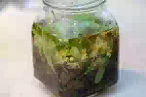 1. Заварить в емкости подходящего объема зеленый чай 2-мя стаканами воды температуры около 80С. Дать ему настояться 1-2 минуты.