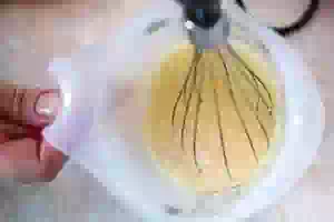 3. Перелить желток в подходящий по размеру стакан и взбить миксером. Лучше использовать именно стакан, т.к. желтка мало и в большой посуде он просто размажется по дну. Взбивать до тех пор, пока масса станет светлой и воздушной.