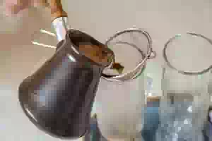 1. В турку засыпать молотый кофе, залить холодной водой, поставить на небольшой огонь и варить до появления шапочки.