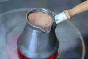 1. В турку засыпать молотый кофе, залить холодной водой, поставить на небольшой огонь и варить до появления шапочки.