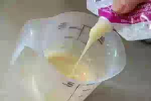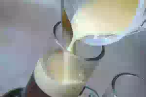 3. Перелить желток в подходящий по размеру стакан и взбить миксером. Лучше использовать именно стакан, т.к. желтка мало и в большой посуде он просто размажется по дну. Взбивать до тех пор, пока масса станет светлой и воздушной.