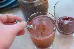 4. Разложить варенье по стаканам. Сколько положить варенья в стакан зависит от сорта ягод/фруктов и ваших предпочтений. По желанию добавить кубики льда.