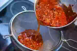 4. Процедить через металлическое сито. Оставшийся в сите жмых хорошо отжать.