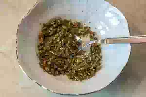 2. В отдельную посуду засыпать 3 ч. ложки измельченного сушеного зверобоя. Если у вас целые стебли сушеного зверобоя, то берите только верхние концы побегов с соцветиями.