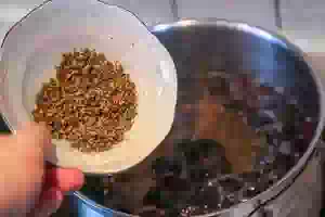 3. В кастрюлю налить воду и засыпать шиповник. Довести воду до кипения, уменьшить огонь и проварить 5 минут. Снять кастрюлю с плиты.