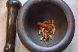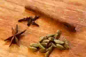 5. В ступку засыпать корицу, бадьян, кардамон (желательно предварительно раздавить коробочки, выбросить створки и оставить только семена), гвоздику. Перетереть пестиком.