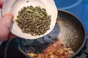 7. Пересыпать в тихо кипящий медовый раствор молотые специи. Добавьте зеленый чай, размешать и снять кастрюлю с огня.