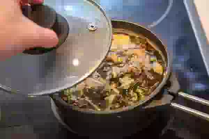 8. Отправить в сбитень тертый имбирь, размешать, накрыть крышкой и дать напитку настояться около 20 минут.