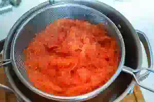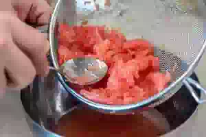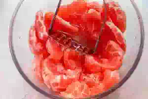 2. Очищенные дольки грейпфрута немного помять картофелемялкой (либо слегка пробить блендером), а затем отжать сок через металлическое сито над миской.