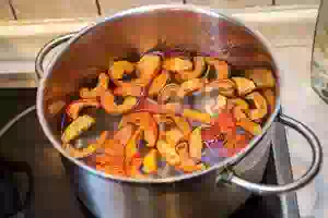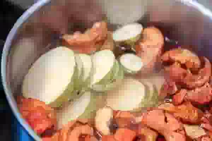 5. В закипевшей воде добавляем грушу, дожидаемся повторного закипания и провариваем на среднем огне 3-5 минут.
