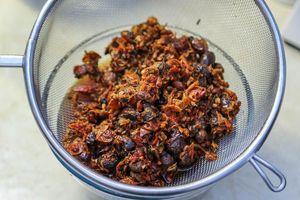 3. Слить отвар через сито в отдельную кастрюльку. Размякшие ягоды шиповника хорошо отжать, собрав сок в кастрюлю.