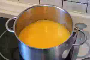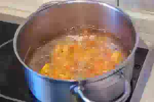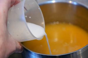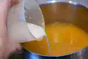 7. Отвар с курагой довести до кипения, а затем тонкой струйкой влить крахмал, помешивая, чтобы не образовалось комочков.