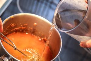 2. Влить в кастрюлю с пюре из боярышника примерно 1 л воды и хорошо размешать. Поставить на небольшой огонь и довести до кипения.