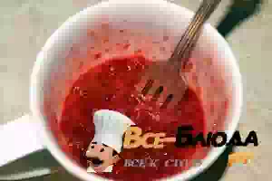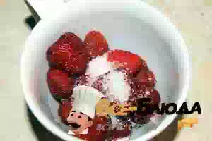 1. Клубнику вымыть, убрать хвостики, сложить ягоды в кружку. Добавить сахар, количество сахара регулируйте в зависимости от сладости клубники.