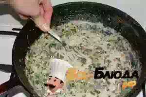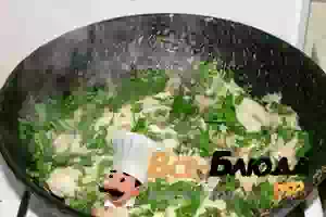 5. Добавьте зелень к рыбе, закройте посуду крышкой. Прибавьте немного огня и кипятите содержимое в течение приблизительно 15 минут, после чего добавьте белого вина и 1/4 стакана воды. Эта жидкость должна полностью покрывать рыбу. Проварите угря при слабом кипении в течение 10-12 минут.