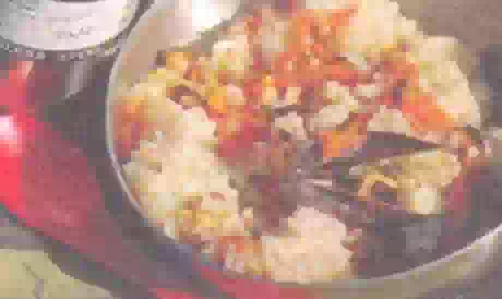 - Затем погрузить в рис мидии с раскрытыми створками и чеснок.