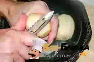 2. Картофель очистить и картофелечисткой нарезать тоненькие ломтики картофеля.