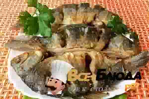 5. Перевернуть и жарить столько же с другой стороны, при этом огонь немного уменьшить. Когда рыба пожарится, уложить на тарелку и добавить немного зелени и подавать на стол. Жареные караси готовы.