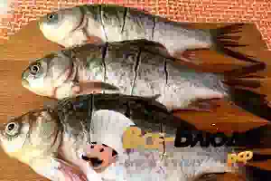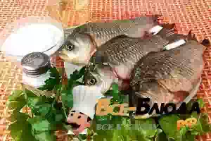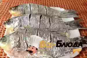 2. На крупных карасях сделать глубокие поперечные насечки. Так мы измельчим мелкие кости, и к тому же рыба лучше прожарится. Посолить карасей со всех сторон. Дать полежать несколько минут, чтобы соль впиталась в мясо.
