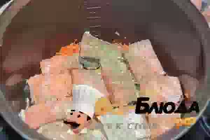 3. На овощную подушку выкладываем рыбные кусочки.