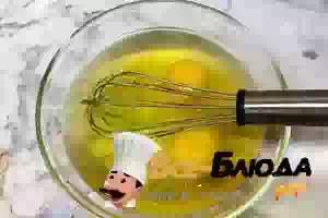 4. Приготовим кляр: в глубокой миске вбиваем вилкой или венчиком яйца с белым вином и ложкой растительного масла и чуть солим.