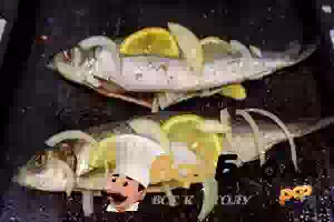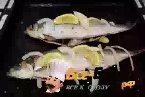 2. Противень или огнеупорную форму, где будете запекать рыбу, смазать растительным маслом, посыпать солью и специями. Разложить на противне дольки лимона и нарезанный кольцами лук. Сверху положить рыбные тушки.