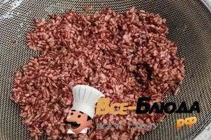 1. Сначала приготовим начинку. Рис промоем несколько раз, пересыплем в кастрюлю с полутора стаканами холодной питьевой воды и поставим на огонь. Как только вода закипит, уменьшим огонь, приоткроем крышку и будем варить рис около 10 минут. После посолим и оставим на огне до полного выпаривания воды. После зальём сваренный рис холодной водой и промоем на сите.