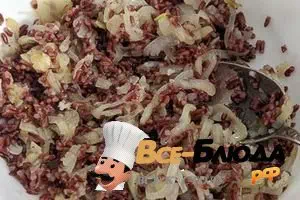 2. Репчатый лук очистим, нарежем полукольцами и обжарим, поперчив и посолив, на растительном масле. На обжарку уйдет примерно 10 десять. В конце добавим измельченный чеснок и хорошо размешаем. Смешаем рис с луком - начинка готова.