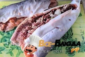 Запеченная горбуша, фаршированная красным рисом с яблоками